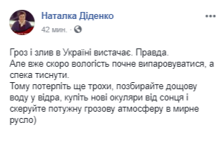 "Уже уже скоро влажность начнет испаряться, а жара давить. Поэтому потерпите еще немного, соберите дождевую воду в ведра, купите новые очки от солнца и направьте мощную грозовую атмосферу в мирное русло," - написала она.