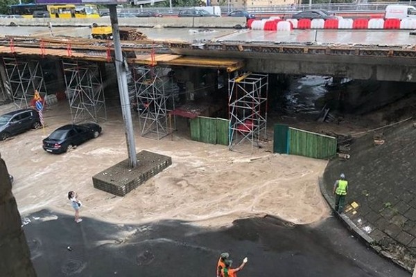 В Киеве после дождя над улицей Кирилловской  по улице Елены Телиги обвалилась часть Кирилловского путепровода, где еще с весны продолжаются ремонтные работы.