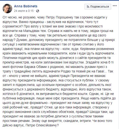 "Руководители развитых стран считают нормальным сообщать, когда и куда едут отдыхать", – добавила Анна Бабинец.