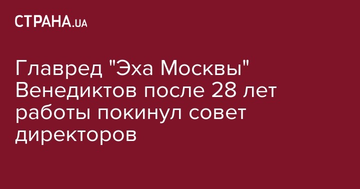 Главред российского оппозиционного радио "Эхо Москвы" Алексей Венедиктов покинул совет директоров компании. Об этом сообщил Венедиктов в Telegram-канале. "Я покинул совет директоров "Эхо Москвы". Миноритарных акционеров теперь там будет представлять мой заместитель Екатерина Годлина", - написал он.