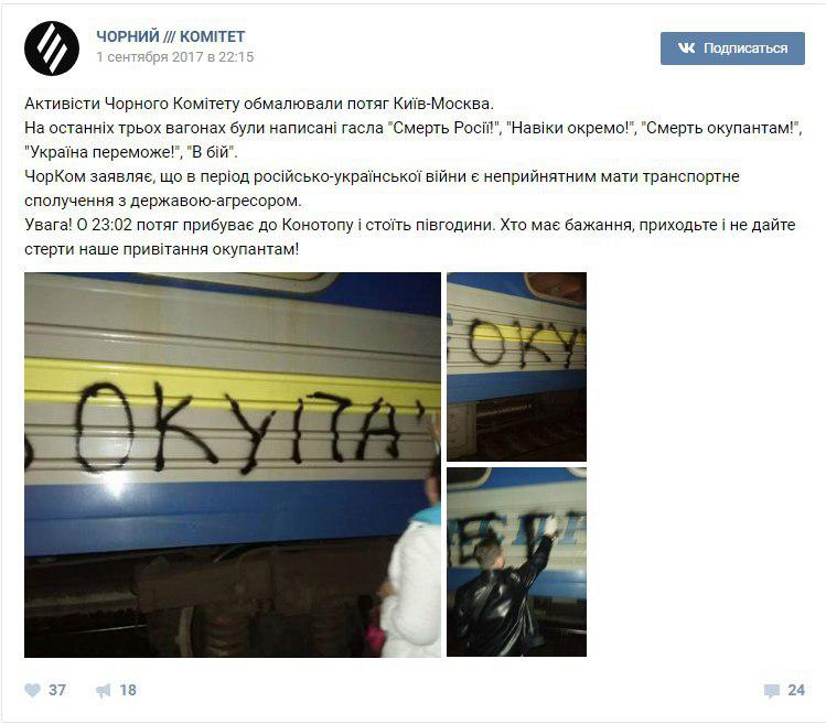 В сентябре 2017 года организация "Черный комитет" похвасталась в соцсети тем, что ее члены разрисовали поезд "Киев - Москва". На вагонах написали: "Смерть России", "Навеки отдельно", "Украина победит". В паблике заявлялось, что организация считает неприемлемым, чтобы Украина имела транспортное сообщение со страной-агрессором.