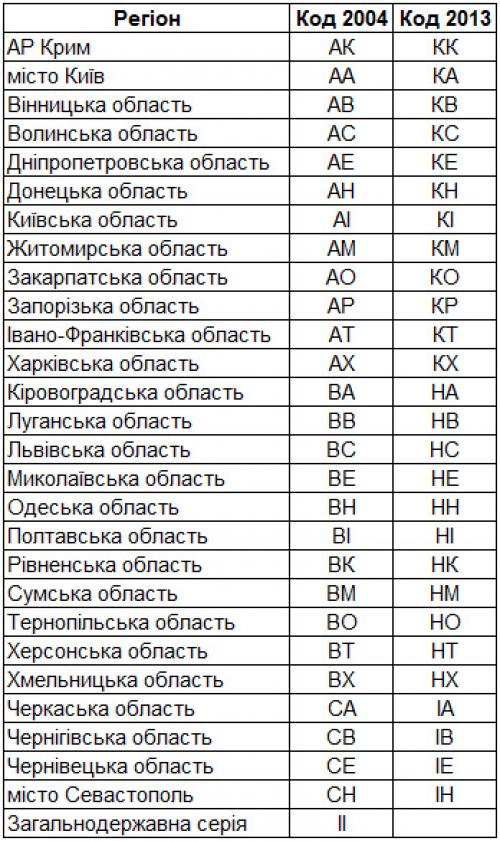 С 2004 года коды регионов были распределены исключительно с использованием букв, совпадающих в латинском и в украинском алфавитах, начиная с Киева: АА, АВ, АС и т.д., в интервалах АА - АХ, ВА - ВО, ВТ - ВХ, СА - СВ, СЕ - СН.