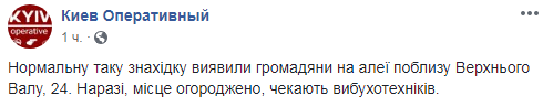 Опасную находку нашли на аллее вблизи строения по адресу Верхний Вал, 24. Место находки ограждено. Вызваны взрывотехники.