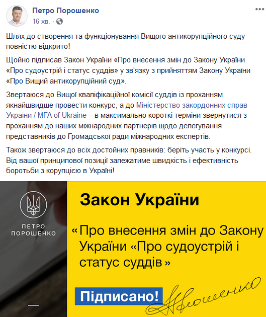 "Путь к созданию и функционированию Высшего антикоррупционного суда полностью открыт! Только что подписал Закон Украины "О внесении изменений в Закон Украины "О судоустройстве и статусе судей" в связи с принятием Закона Украины" О Высшем антикоррупционном суде".