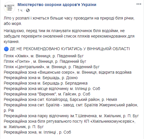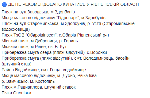 В список нерекомендованных попали пляжи в рекреационных зонах ряда городов Винницкой и Житомирской областей, Чернигова на Десне, а также некоторые пляжи рек Уж, Латорица, Синявка и Иршавка в Закарпатье.