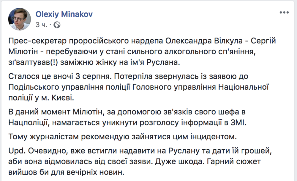 Блогер Алексей Минаков опубликовал в Facebook информацию, что пресс-секретарь нардепа Александра Вилкула Сергей Милютин изнасиловал замужнюю женщину по имени Руслана будучи в состоянии алкогольного опьянения. Якобы женщина уже подала заявление в Подольское райуправление полиции.