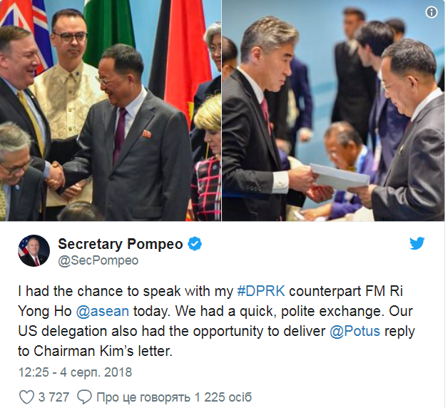 В субботу, 4 августа делегация США передала лидеру КНДР Ким Чен Ыну письмо от Дональда Трампа. Его письменный ответ на послание из Северной Кореи отдали главе МИД КНДР Ри Эн Хо.