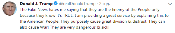 "Fake News ненавидят меня за высказывание, "что они - враги народа" - только потому, что они знают, что это ПРАВДА. Я оказываю большую услугу, объясняя это американскому народу. Они нарочно вызывают большой раздор и недоверие. Они также могут вызвать Войну! Они очень опасны и больны!", - написал президент в Twitter в воскресенье, 5 августа.