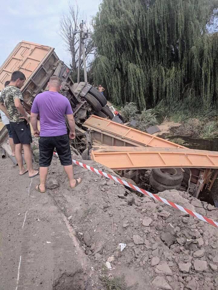 "Авария возле моста на Заслучье в Староконстантинове. По предварительной информации: у фуры выстрелило колесо. Одного человека извлекли, водителя достают", – отметил он.