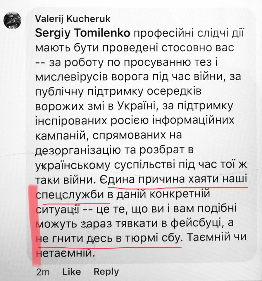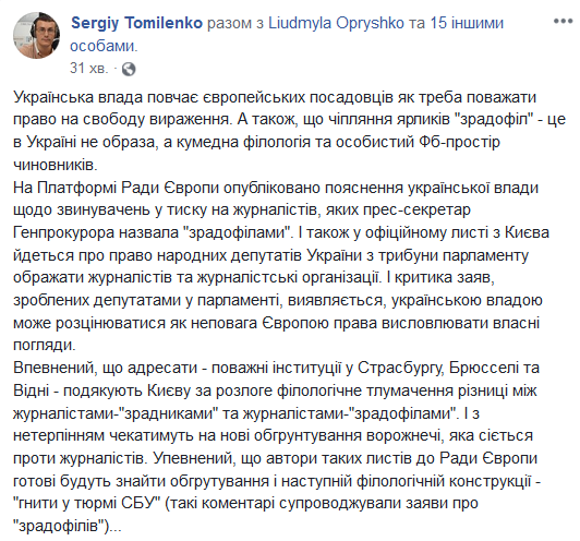 Уверен, что адресаты - уважаемые институты в Страсбурге, Брюсселе и Вене - поблагодарят Киеву за пространное филологическое толкование разницы между журналистами - "предателями" и журналистами - "зрадофилами". И с нетерпением будут ждать новые обоснования вражды, которая сеется против журналистов. Уверен, что авторы таких писем в Совет Европы готовы будут найти обоснование и последующей филологической конструкции - "гнить в тюрьме СБУ" (такие комментарии сопровождали заявления о "зрадофилах"), - написал Сергей Томиленко.