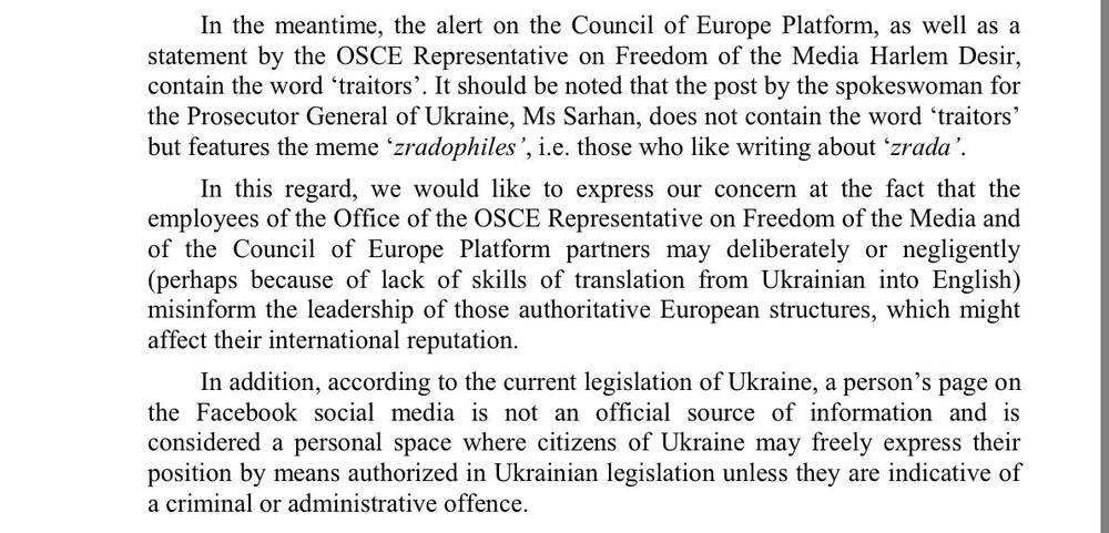 На платформе Совета Европы опубликовано объяснение украинской власти относительно обвинений в давлении на журналистов, которых пресс-секретарь генпрокурора назвала "зрадофилами". И также в официальном письме из Киева говорится о праве народных депутатов Украины с трибуны парламента оскорблять журналистов и журналистские организации. И критика заявлений, сделанных депутатами в парламенте, оказывается, украинской властью может расцениваться как неуважение Европой права выражать собственные взгляды.