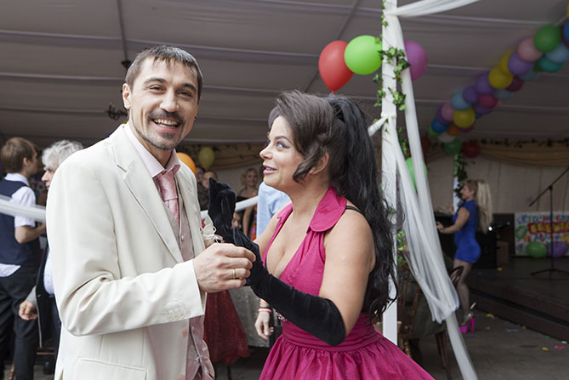 Певица Наташа Королева органично вписалась в атмосферу 90-х, она исполнила свою композицию "Синие лебеди", поздравила молодых и крикнула: "Горько!"