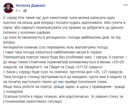 "Есть среди лета такое время для синоптиков, когда можно написать один прогноз на несколько дней вперед и поехать куда-то отдыхать. Или гулять в парке, или наконец выгладить все стирки или добраться до дальних полок в кухонных шкафчиках. Это когда устанавливается антициклон и погода ближайших дней, как под копирку. Антициклон означает сухую, преимущественно ясную маловетреная погоду. И именно такая погода ожидается в ближайшее время в Украине", - написала синоптик.
