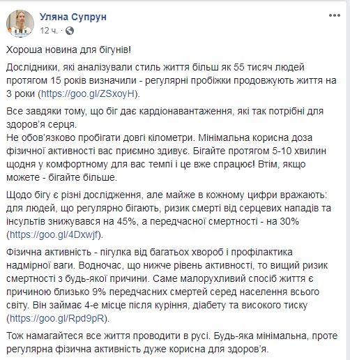 Даже небольшие ежедневные пробежки снижают риск смерти от сердечных приступов, инсультов и преждевременной смерти. Об этом сообщила и. о. министра здравоохранения Ульяна Супрун в Facebook.