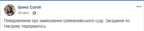 "Сообщение о заминировании Шевченковского суда. Заседание по Насирову прервалось". - написала она.