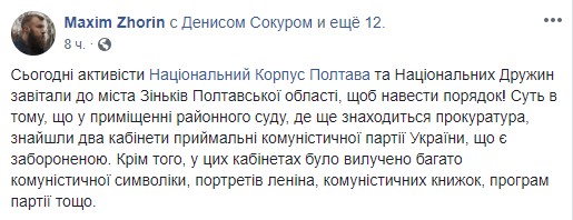 В Полтавской области в городе Зеньков в здании суда и прокуратуры активисты обнаружили приемную запрещенной Компартии. Об этом сообщил у себя в Facebook бывший боец полка Азов, представитель Национального корпуса Максим Жорин.