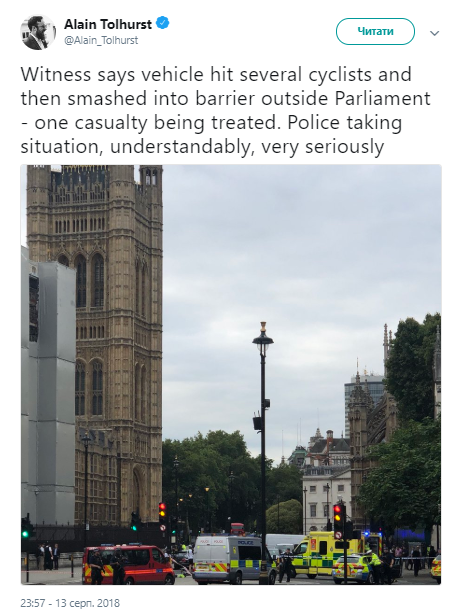 Как сообщают в соцсети очевидцы, водитель сбил нескольких велосипедистов, а затем врезался в забор у парламента. Продолжается полицейская операция, улицы в районе места инцидента оцеплены правоохранителями.