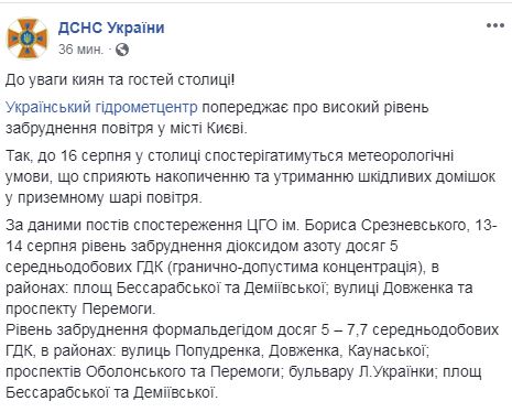 По данным Центральной геофизической обсерватории им.Бориса Срезневского, 13-14 августа уровень загрязнения диоксидом азота в Киеве достиг 5 среднесуточных ПДК (предельно допустимая концентрация), в районах: площадь Бессарабская, площадь Демеевская; ул.Довженко и проспект Победы.