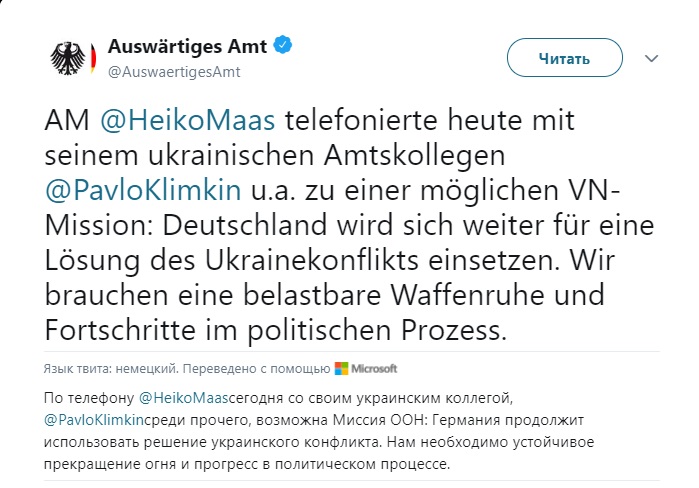 "Министр Маас обсудил сегодня по телефону со своим коллегой в том числе возможную миссию ООН", - отметили в МИД Германии.
