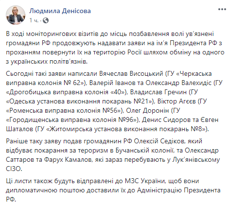 "В ходе мониторинговых визитов в места лишения свободы заключенные граждане РФ продолжают подавать заявления на имя президента РФ с просьбой вернуть их на территорию России путем обмена на одного из украинских политзаключенных. Сегодня такие заявления написали Вячеслав Высоцкий (Черкасская исправительная колония №62), Валерий Иванов и Александр Валехидис (Дрогобычская исправительная колония №40), Владислав Гречин (Одесское учреждение исполнения наказаний №21), Виктор Агеев (Роменська исправительная колония №56), Олег Доронин (Городищенская исправительная колония №96), Денис Сидоров и Евгений Шаталов (Житомирское учреждение исолнения наказаний №8)", - написала Денисова на своей странице в соцсети Facebook в среду.