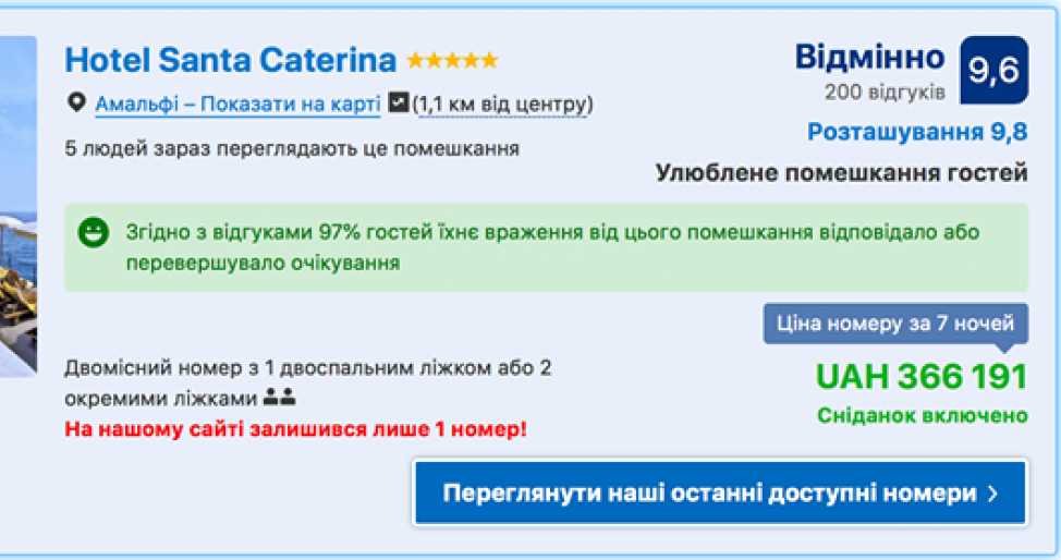Согласно сайту booking.com цена за 7 ночей в августе стартует от 366 000 гривен (Цены могут варьироваться в зависимости от даты заказа).