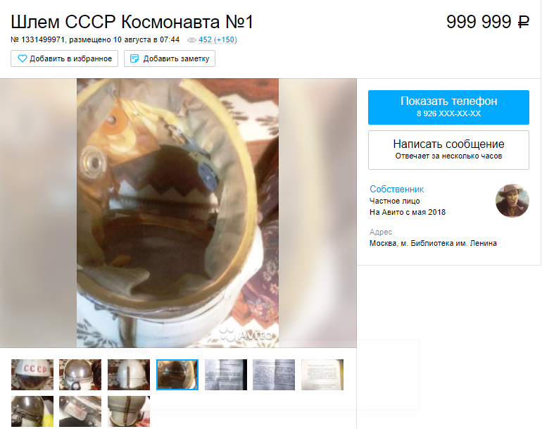 Личные вещи космонавта Юрия Гагарина выставлены на продажу на сайте Avito. Здесь появились объявления о продаже шлема от скафандра Юрия Гагарина, поздравительной открытки и его фотографии. Об этом сообщается на сайте Avito.