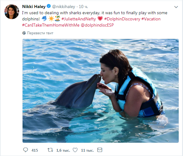 В частности, Никки Хейли выложила серию фотографий с отдыха и отметила, что ей, как человеку, который "имеет дело с акулами ежедневно, было весело наконец поиграть с дельфинами".