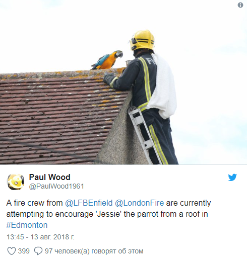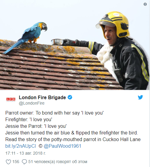 В Лондоне самка попугая по кличке Джесси долго не могла спуститься с крыши дома. Хозяевам пришлось  вызвать на помощь пожарных. И когда один из спасателей поднялся к птице по лестнице она ответила ему на приветствие "Я тебя люблю", добавив "Иди на @уй". Об этом сообщает "Медуза" со ссылкой на London Fire Brigade в Twitter.