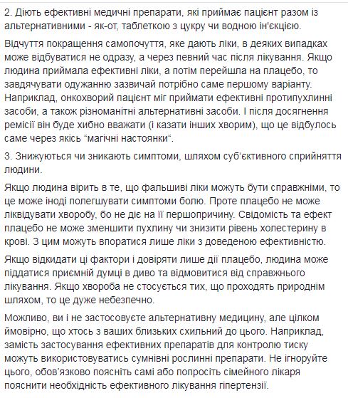По данным Супрун, еще в 2010 году были проведены исследования, результатом которых стал вывод, что плацебо не имеет значимого клинического эффекта, существует лишь некоторое влияние на симптомы боли и тошноты.