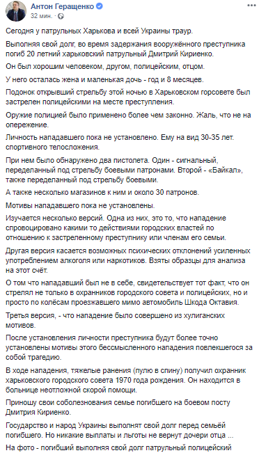"Сегодня у патрульных Харькова и всей Украины траур. Выполняя свой долг, во время задержания вооружённого преступника погиб 20 летний харьковский патрульный Дмитрий Кириенко. Он был хорошим человеком, другом, полицейским, отцом.