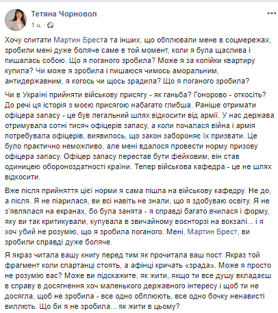 Уже после принятия этой нормы я сама пошла на военную кафедру. Не до, а после. Я не пиарилась, вы все даже не знали, что я получаю образование", - пишет в соцсети нардеп и подчеркивает, что военную форму она купила в "обычном военторге на вокзале" ... и я хоть убей не понимаю, что я сделала плохого. Мне, Мартин Брест, вы сделали действительно очень больно.