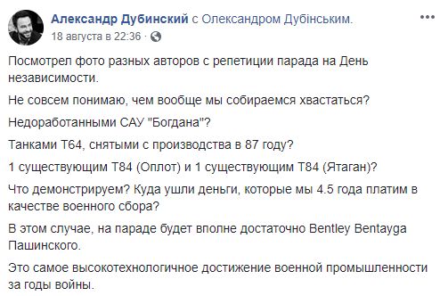 Журналист Александр Дубинский говорит о том, что техника для парада - морально устарела. "Посмотрел фото разных авторов с репетиции парада на День независимости. Не совсем понимаю, чем вообще мы собираемся хвастаться? Недоработанными САУ "Богдана"? Танками Т64, снятыми с производства в 87 году? 1 существующим Т84 (Оплот) и 1 существующим Т84 (Ятаган)?