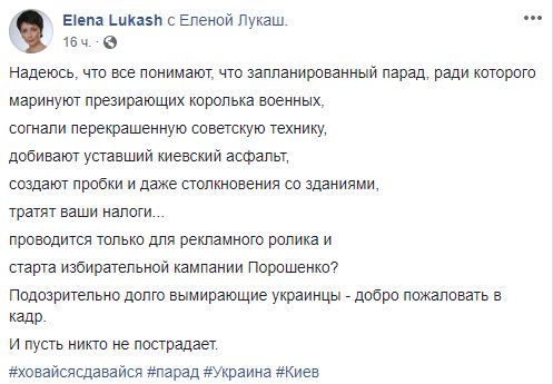 Экс-депутат, адвокат Елена Лукаш говорит о том, зачем проводится парад: " Надеюсь, что все понимают, что запланированный парад, ради которого: маринуют презирающих королька военных, согнали перекрашенную советскую технику, добивают уставший киевский асфальт, создают пробки и даже столкновения со зданиями, тратят ваши налоги... проводится только для рекламного ролика и старта избирательной кампании Порошенко?