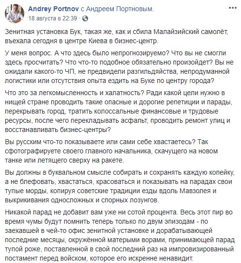 "А чё за парад? Мы уже всех врагов победили ? Или я как налогоплательщик давал свое добро чтоб за мои ( наши ) деньги палили тысячи литров солярки ,перекрывали весь город и тд. Абсурдность парада очевидна...совок не умер в головах наших правителей", - пишет киевский предприниматель Андрей Чудовский.