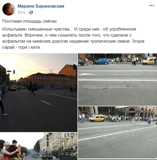 Журналист Денис Попович решил потролить тех, кто жалуется на сломанный асфальт. Он переиначил известное стихотворение Ивана Франко в связи с грядущим парадом: "Посвящается соотечественникам, которых беспокоит состояние асфальтового покрытия на Крещатике, после прохождения военной техники по случаю Дня Независимости.