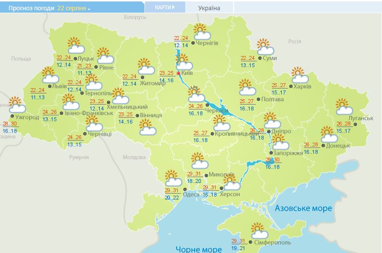 Сегодня, 22 августа, к погоде во всех областях Украины не придраться: будет солнечно и без осадков, а на юге до +31 градуса тепла. Об этом сообщает сайт Укргидромецентра.