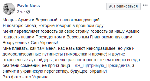 Мне плевать, как там меня, нас называют неисправимые, но уже и деморализованные путинисты (тимошенки и прочие) и другие откровенные аутсайдеры, я еще раз повторю то, о чем говорю всегда: без тени сомнений, не пряча лица – #Я_Підтримую_Президента, а значит и украинскую перспективу, будущее, Украину! Это фото - это Украина", пишет близкий к Порошенко блогер Павел Нусс.