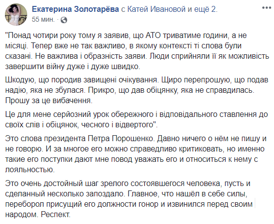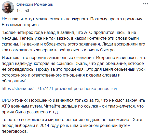 "Порошенко извинился только за то, что не смог закончить АТО военным путем. Читайте дальше по ссылке - он там жалуется, что армия была развалена и т.д.