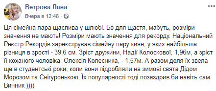 "Эта семейная пара счастлива в браке. Потому что для счастья, пожалуй, размеры значения не имеют! Размеры имеют значение для рекорда... А вместе судьба их свела еще в студенческие годы, когда они подрабатывали на зимние праздники Дедом Морозом и Снегурочкой. Их популярности тогда позавидовал бы даже сам Винник))))", - написала в соцсети Лана Ветрова.