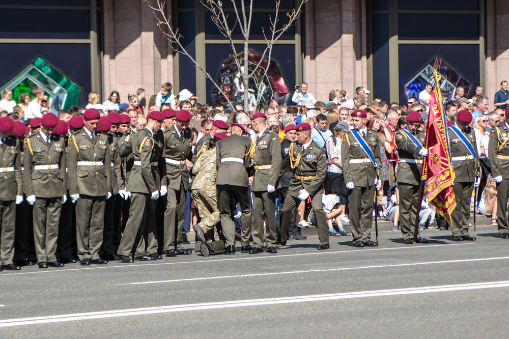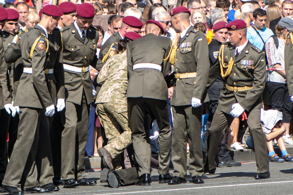В четверг, 24 августа в Киеве на параде в честь 27 годовщины независимости, кроме военного из почетного караула, потерял сознание и солдат Десантно-штурмовых войск Украины. Боец упал во время минуты молчания в честь памяти погибших украинцев. Об этом сообщает Информатор.