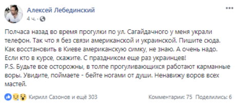 "Полчаса назад во время прогулки по ул. Сагайдачного у меня украли телефон. Так что я без связи американской и украинской. Пишите сюда. Как восстановить в Киеве американскую симку, не знаю. А очень надо. Если кто в курсе, скажите. С праздником еще раз украинцев! P.S. Будьте все осторожны, в толпе прогуливающихся работают карманные воры. Увидите, поймаете - бейте ногами от души. Ненавижу воров всех мастей", -написал он.