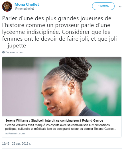 Однако его слова вызвали волну критики. Редактор газеты Le Monde Diplomatique Мона Шолле написала в Twitter, что он "говорит с одной из величайших теннисисток в истории, как директор говорит с недисциплинированной лицеистской".