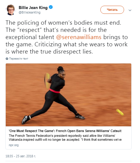 Знаменитая американская теннисистка 60-80-х годов и борец за равноправие в спорте Билли Джин Кинг также отметила, что стоит уважать Серену Уильямс - за то, как она играет, а не в чем она одета.