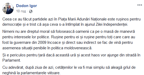 "То, что сделали партии на площади Великого Национального собрания - это позор для демократии, и очень грустно, что это происходит накануне Дня независимости. Никто не имеет морального права использовать людей для маневров в своих политических интересах", - написал Додон.