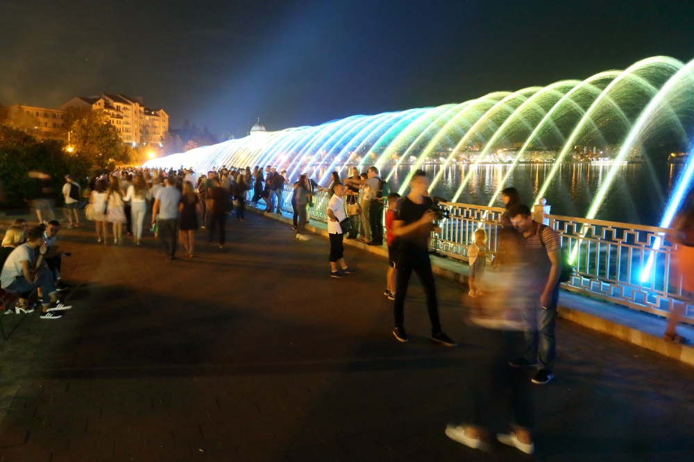 Фонтан светится сине-желтыми цветами. Накануне Дня независимости была обустроена очередная линия фонтана, которая тянется от причала в направлении Надставной церкви.