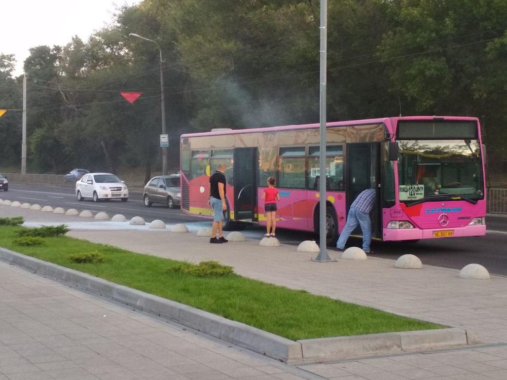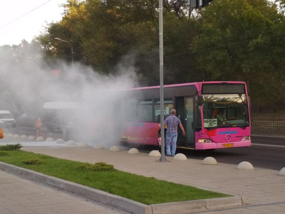 В городе Днепр на Сичеславской Набережной возле одного из ресторанов задымился автобус. Он ехал в центр города и имел маршрут №120. На момент задымления в салоне находились пассажиры.