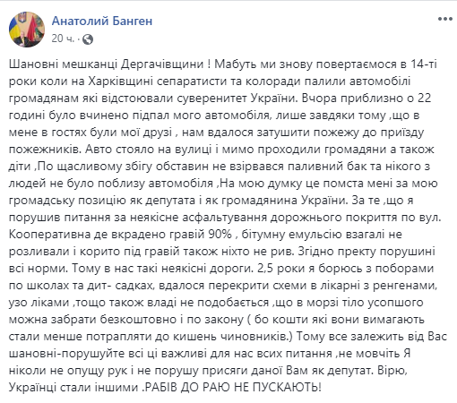 "По счастливому стечению обстоятельствах не взорвался топливный бак и никого из людей не было поблизости автомобиля, на мой взгляд, это месть мне за мою гражданскую позицию как депутата и как гражданина Украины", - написал Банген.