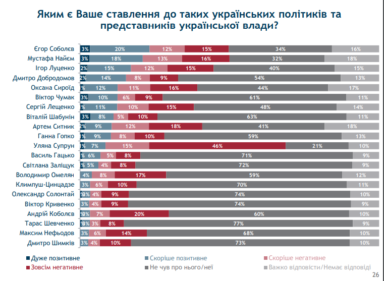Респонденты должны были дать ответ на вопрос: "Каково ваше отношение к таким украинским политикам и представителям украинской власти?". В антирейтинг попал 21 политик. Возглавила список Ульяна Супрун, которой 46% опрошенных украинцев выразили свое негативное отношение.