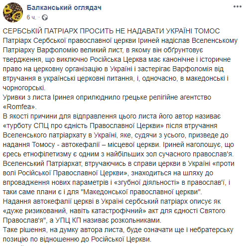 Сербский патриарх сообщил, что решил написать письмо с "заботой СПЦ о единстве Православной Церкви". Ириней заявляет, что "ересь этнофилетизма" является одним из главнейших зол современного православия.