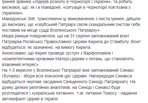 Предоставления автокефалии церкви в Украине сербский патриарх описывает как "очень рискованный, даже катастрофический" акт для единства Святого Православия, а УПЦ КП называет раскольниками. Такое решение, по мнению автора письма, будет означать еще и небратскую позицию по отношению к Русской Церкви.
